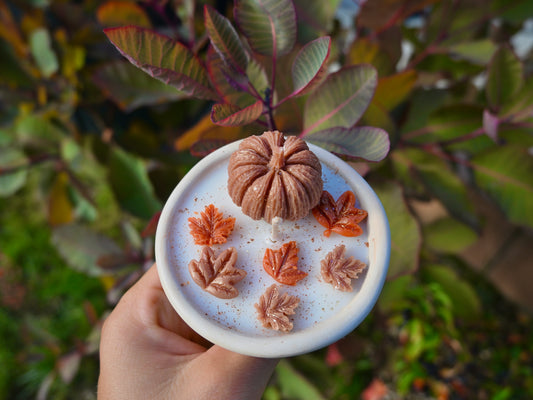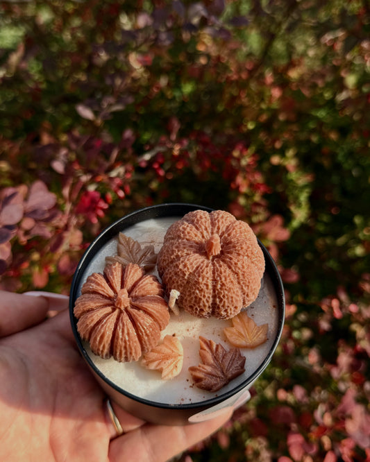 Každá sviečka je ručne vyrábaná s láskou a dôrazom na detail. Zdobia ju voskové tekvičky, škorica, plátky pomaranča a jesenné lístky, ktoré vytvárajú jedinečný dizajn. Používame 100% prírodný sójový vosk, ktorý horí čisto, dlhšie a je šetrný k zdraviu aj prírode.