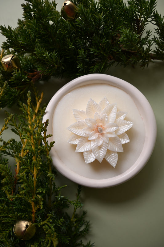 Každá sviečka je ručne odlievaná zo 100 % prírodného sójového vosku, doplnená o jedinečné ozdoby – od nežných snehových vločiek, cez vianočné ruže až po elegantné metalické akcenty. Všetky sú vytvorené s láskou a precíznosťou, aby priniesli do tvojho priestoru harmóniu, pokoj a sviatočnú atmosféru.