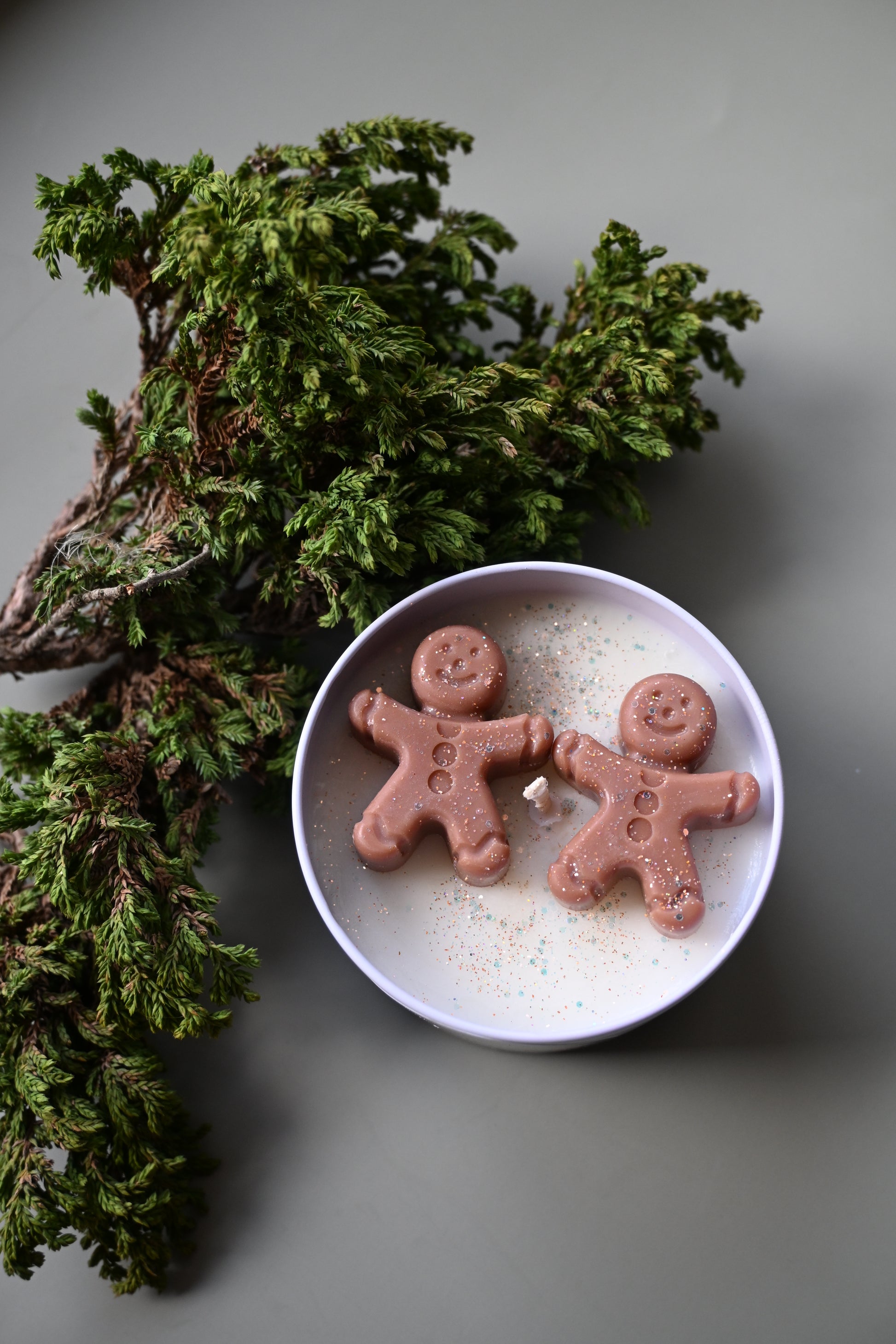 Vyrobená zo 100 % prírodného sójového vosku, doplnená o ručne odlievané ozdoby v tvare medovníkových panáčikov, posypaná jemným trblietavým práškom – ako stvorená na zimné večery pri svetle sviečok.
