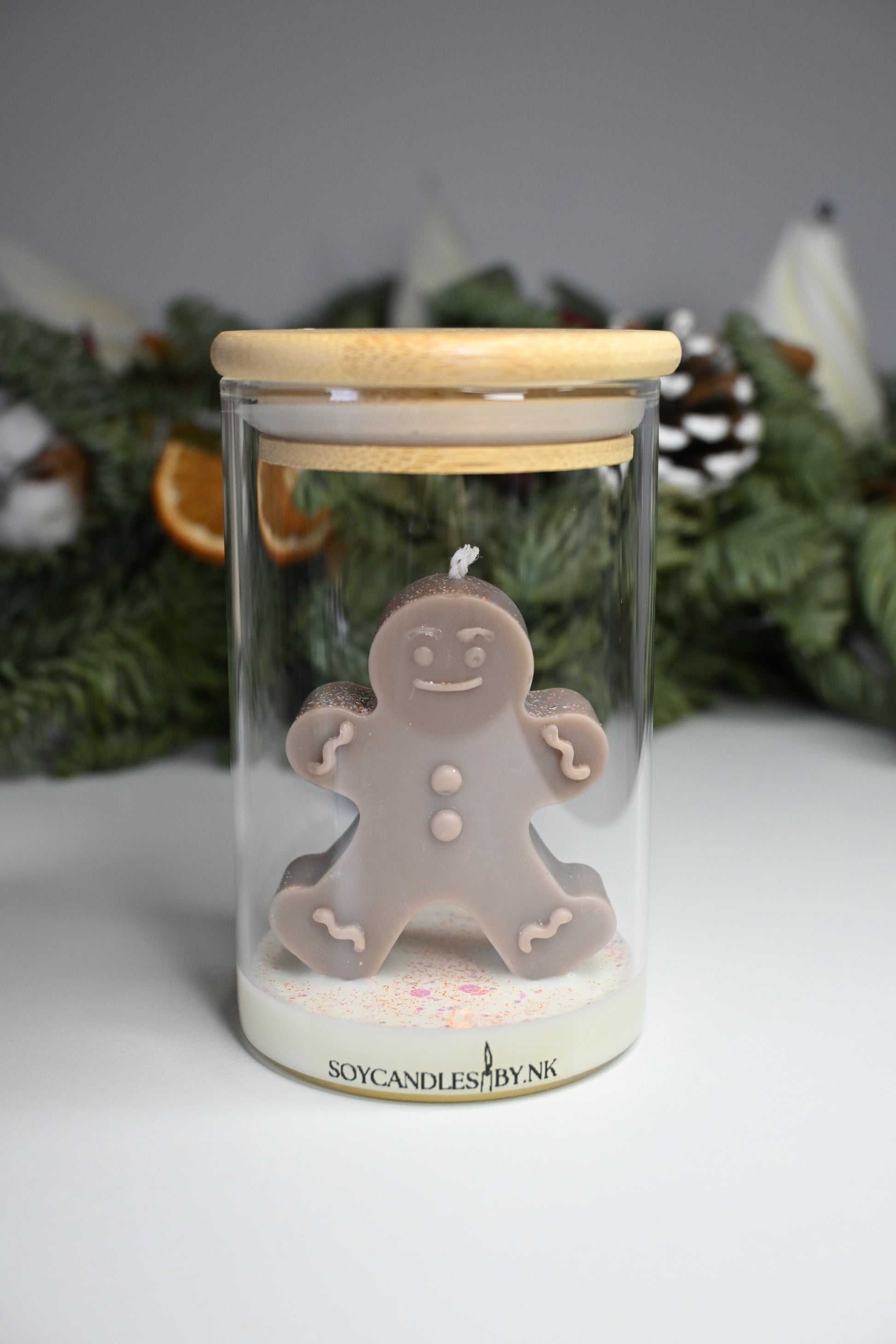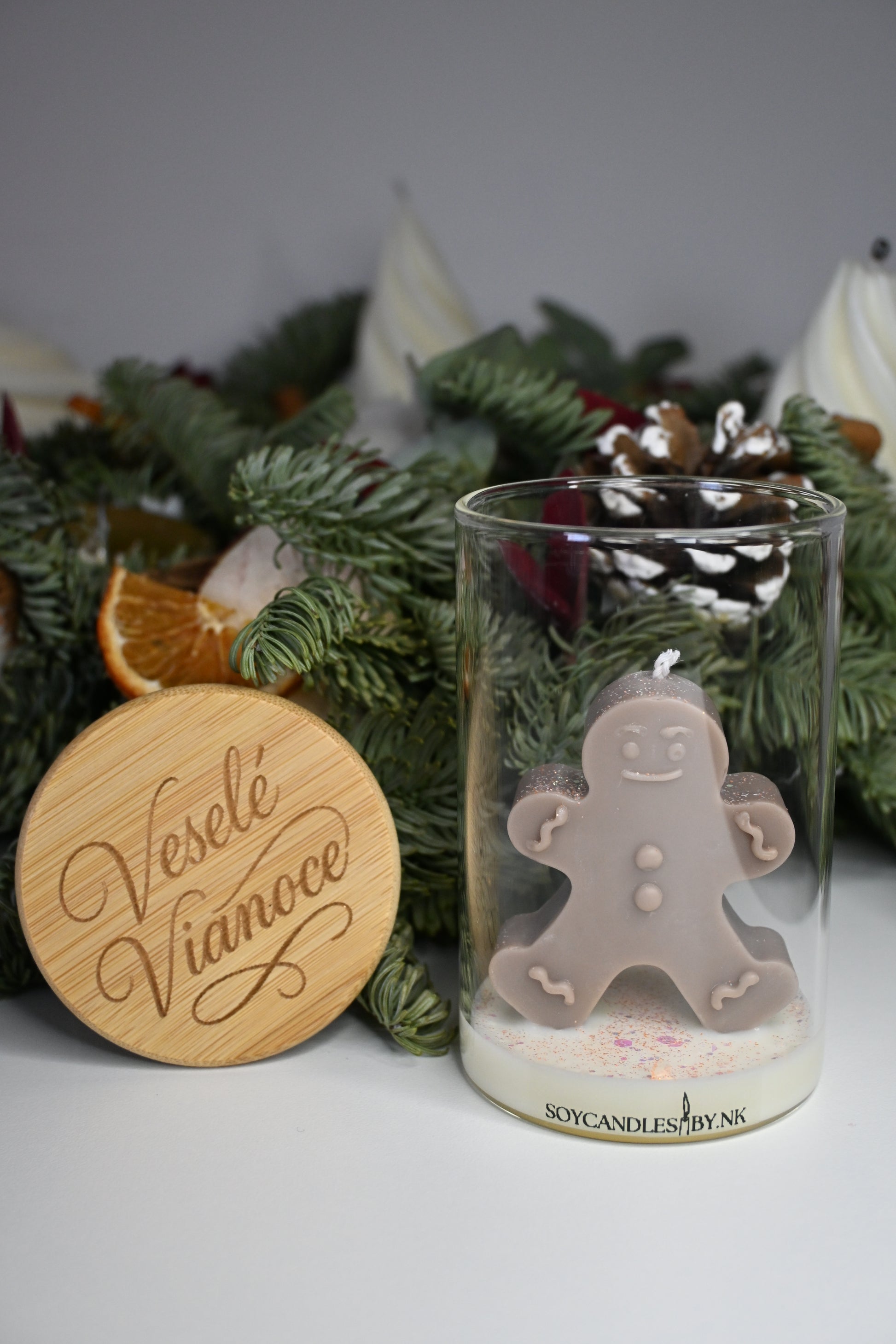 Rozvoňajte svoj domov sviatočnou atmosférou s originálnou sójovou sviečkou v tvare veselého perníčka. Sviečka je ručne odlievaná zo 100 % prírodného sójového vosku a umiestnená vo sklenom pohári s gravírovaným bambusovým viečkom „Veselé Vianoce“.