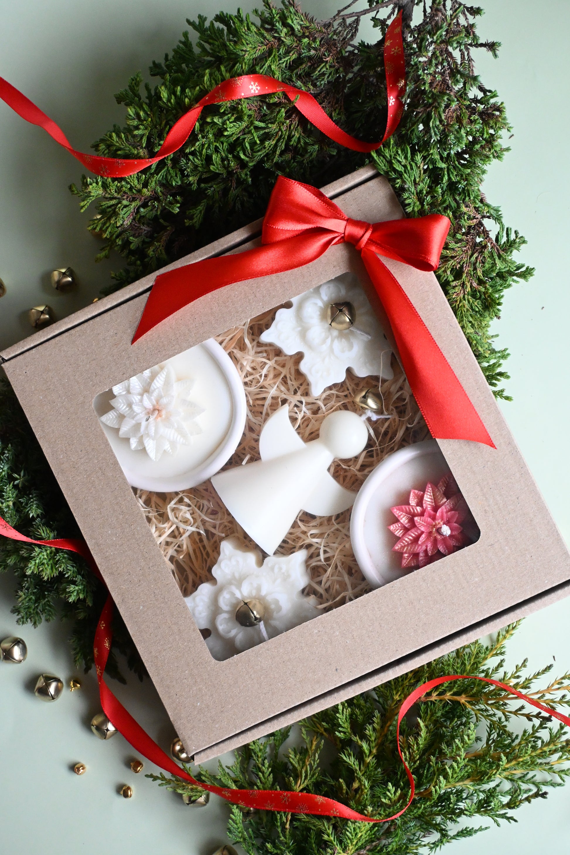 Nežná a elegantná darčeková sada, ktorá v sebe spája pokoj, svetlo a vôňu Vianoc. Ručne vyrábané sójové sviečky v tvare anjela, snehových vločiek a kvetov v miske vytvárajú nádhernú sviatočnú dekoráciu s vôňou pomaranča, škorice a vareného vína.