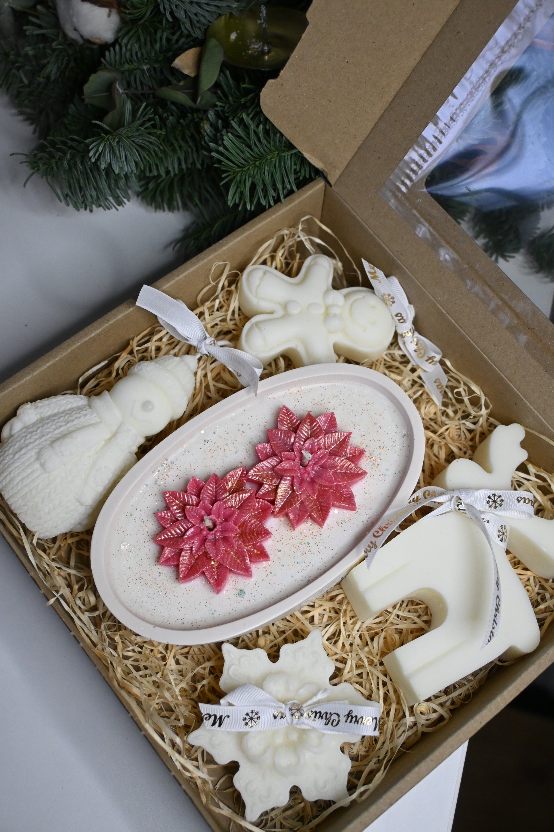 Každý kúsok je ručne odlievaný z prírodného sójového vosku, starostlivo zabalený v drevitej výplni a previazaný elegantnou vianočnou stužkou. Set vytvára dokonale harmonický, sviatočný vizuál a nádherne prevonia každý domov.