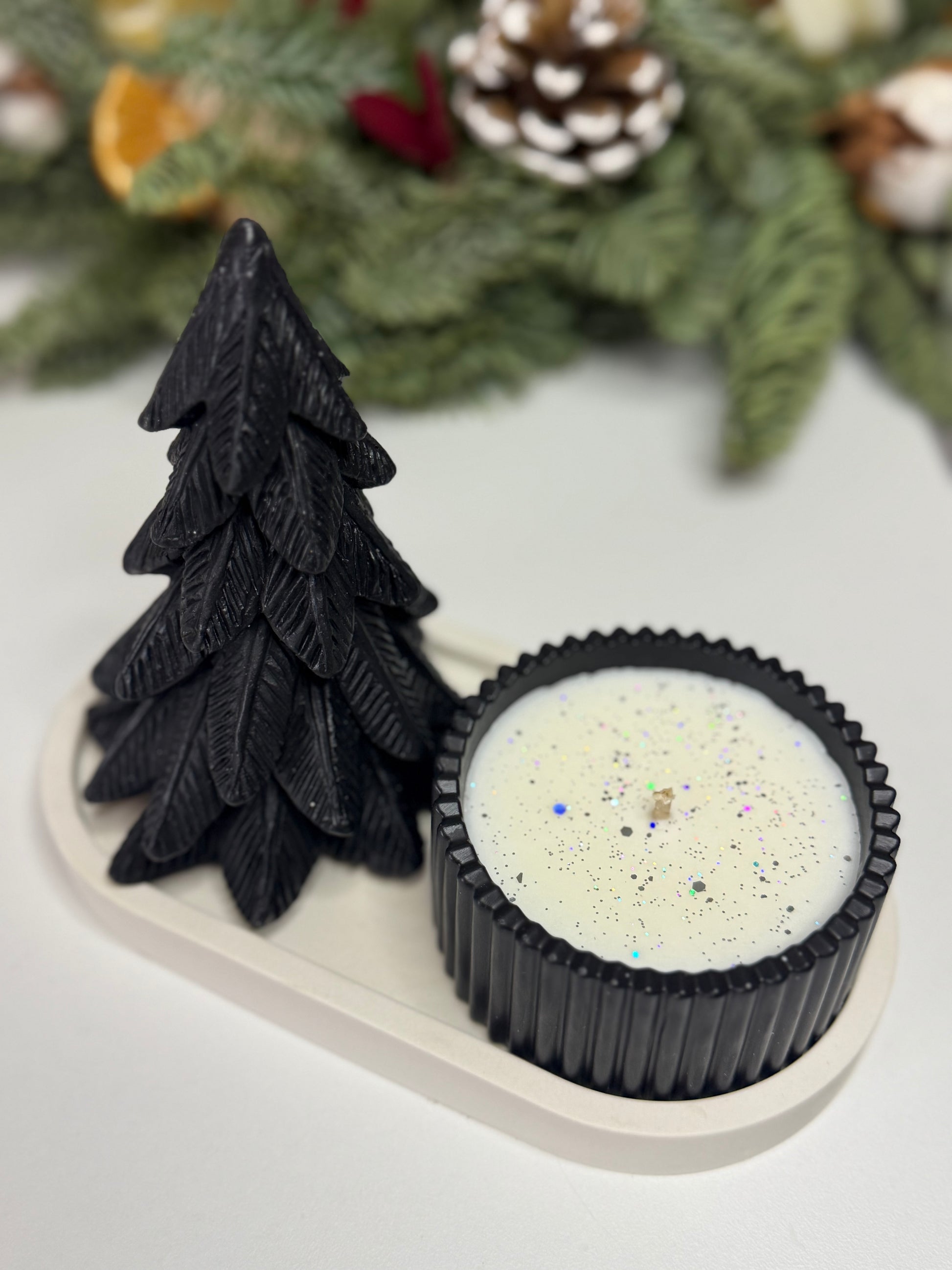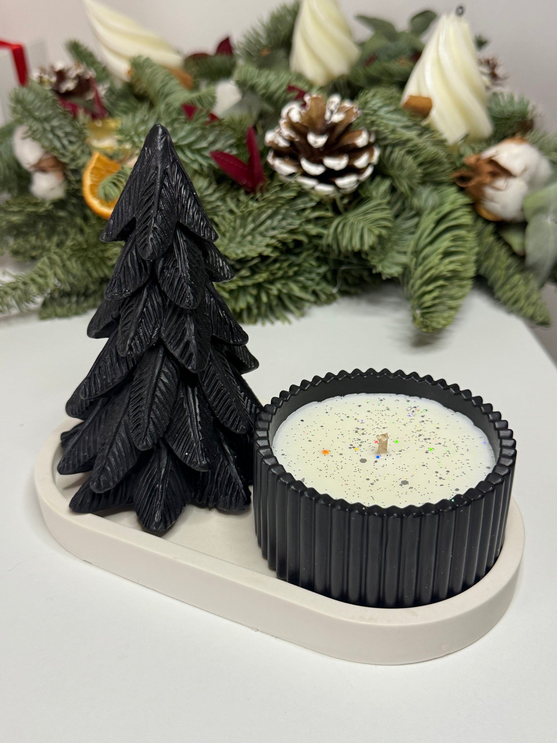 Set obsahuje čiernu dekoratívnu jedličku, ručne robenú sójovú sviečku v štýlovom rebrovanom pohári s podnosom z jesmonitu.