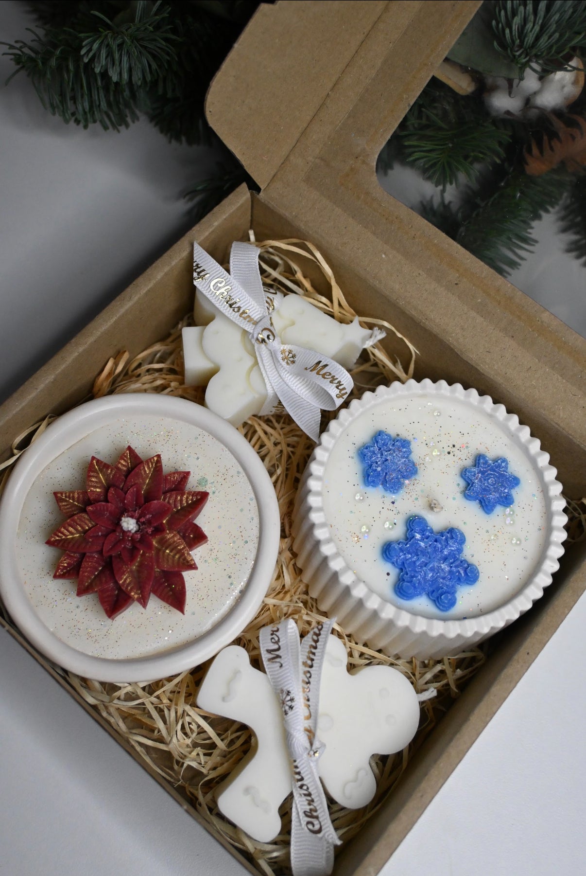 Elegantná vianočná sada ručne vyrábaných sviečok zo 100 % prírodného sójového vosku, ktorá vnesie do domova teplo, pokoj a sviatočnú atmosféru. Sada je ladená v jemných zimných farbách s dekoratívnymi detailmi a doplnená o voskové ozdoby v tvare vločky a perníčka.
