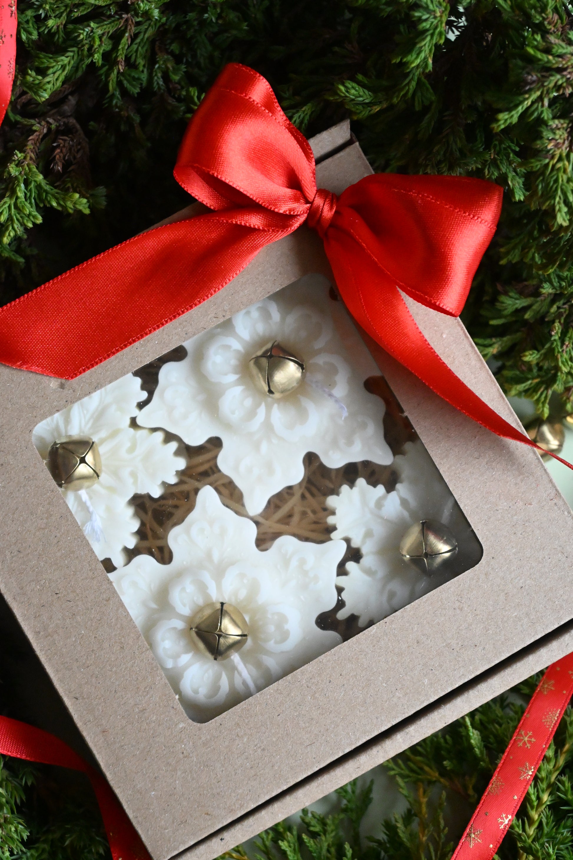 Každá vločka je odliata zo 100 % prírodného sójového vosku a ozdobená zlatým zvončekom, ktorý dotvára čarovný sviatočný detail.