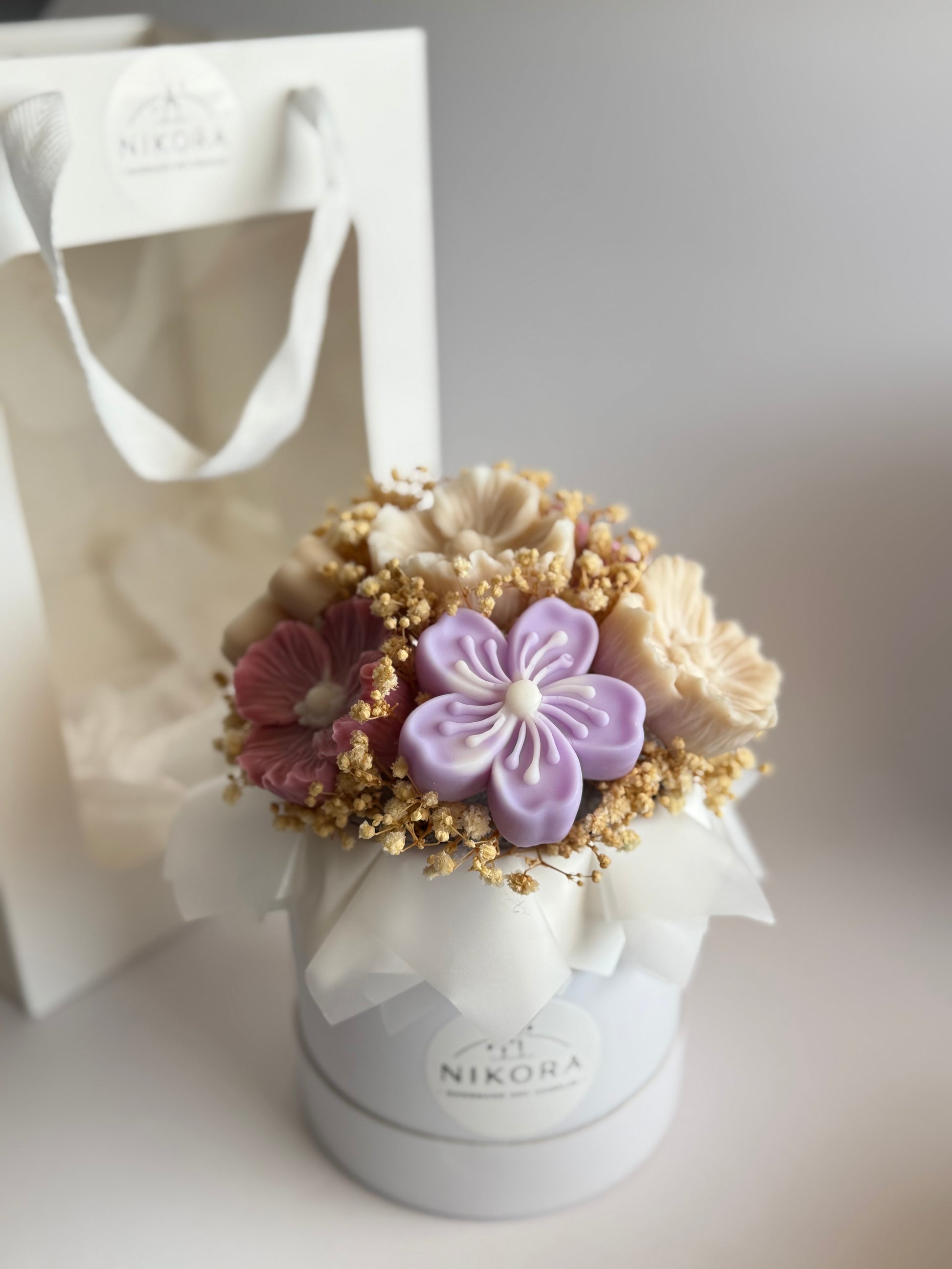 Exkluzívna ručne vyrábaná sviečka v kvetinovom prevedení, ktorá spája eleganciu, remeslo a prírodné materiály.