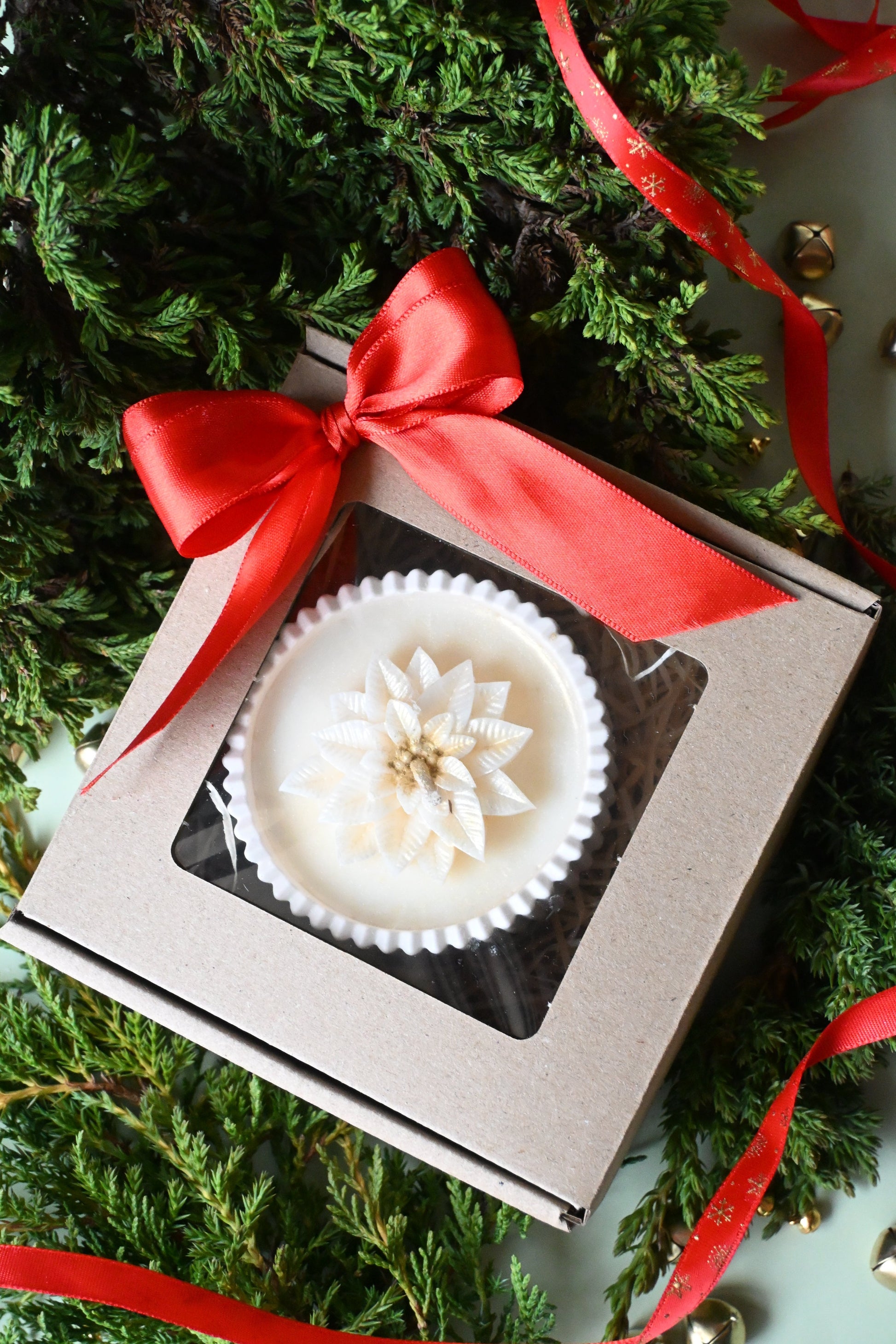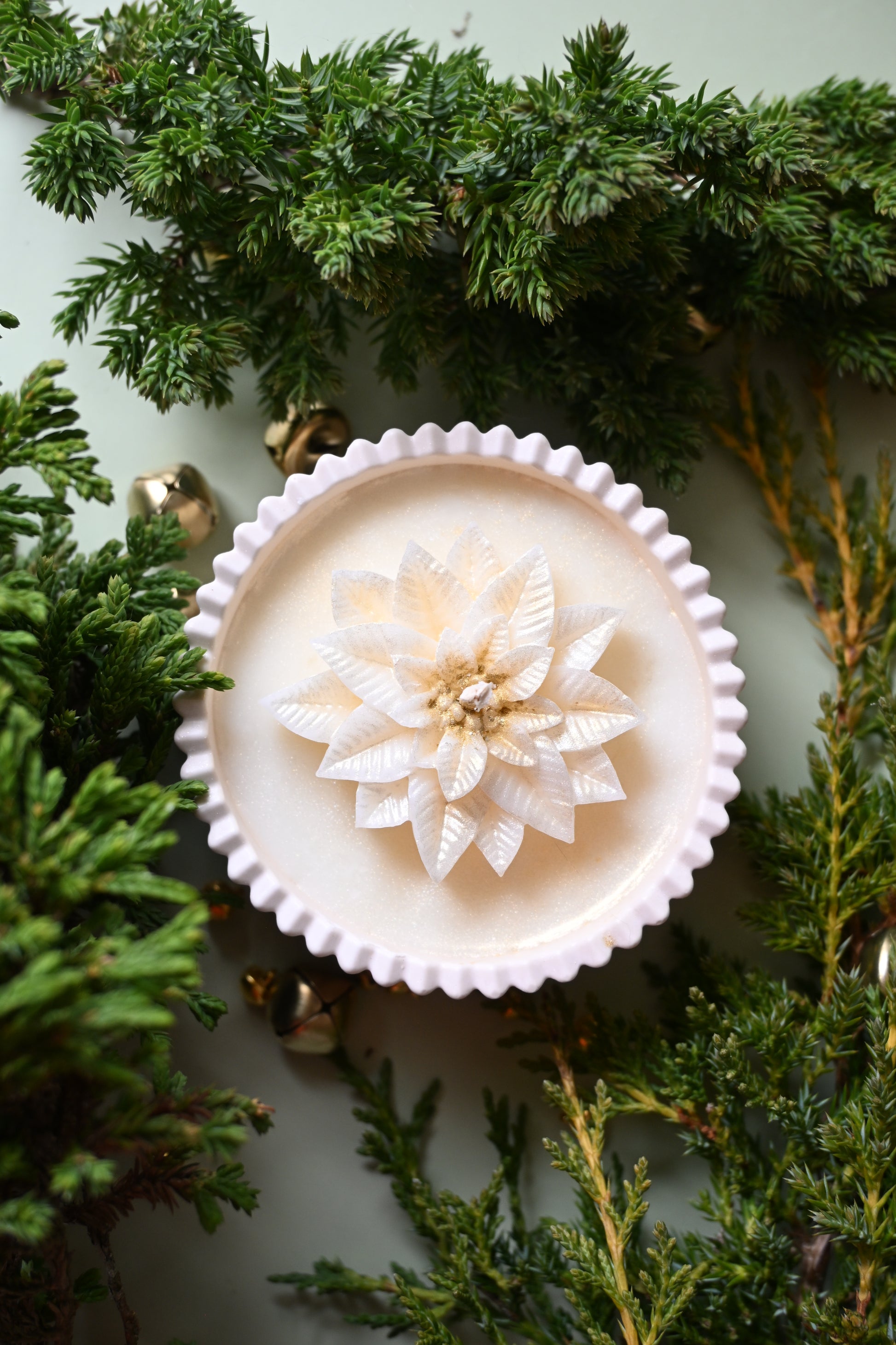 Každá sviečka je originál – nádoba je vyrobená z ekologického Jesmonitu a doplnená detailne spracovaným kvetom vianočnej ruže.