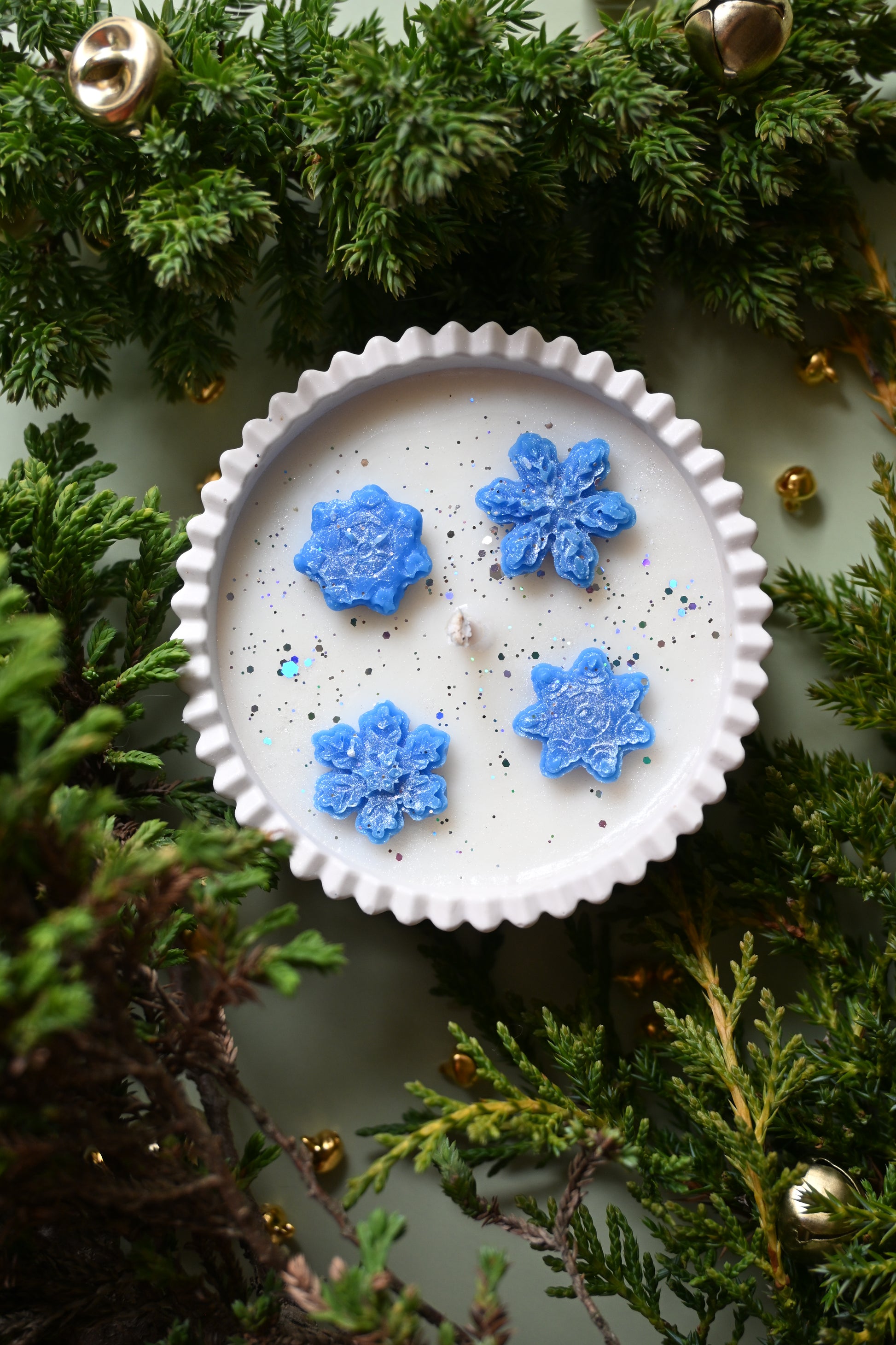 Každý kus je ručne odliaty zo 100 % prírodného sójového vosku a ozdobený modrými vločkami z vosku, ktoré vytvárajú jedinečný zimný efekt doplnený jemnými trblietkami.