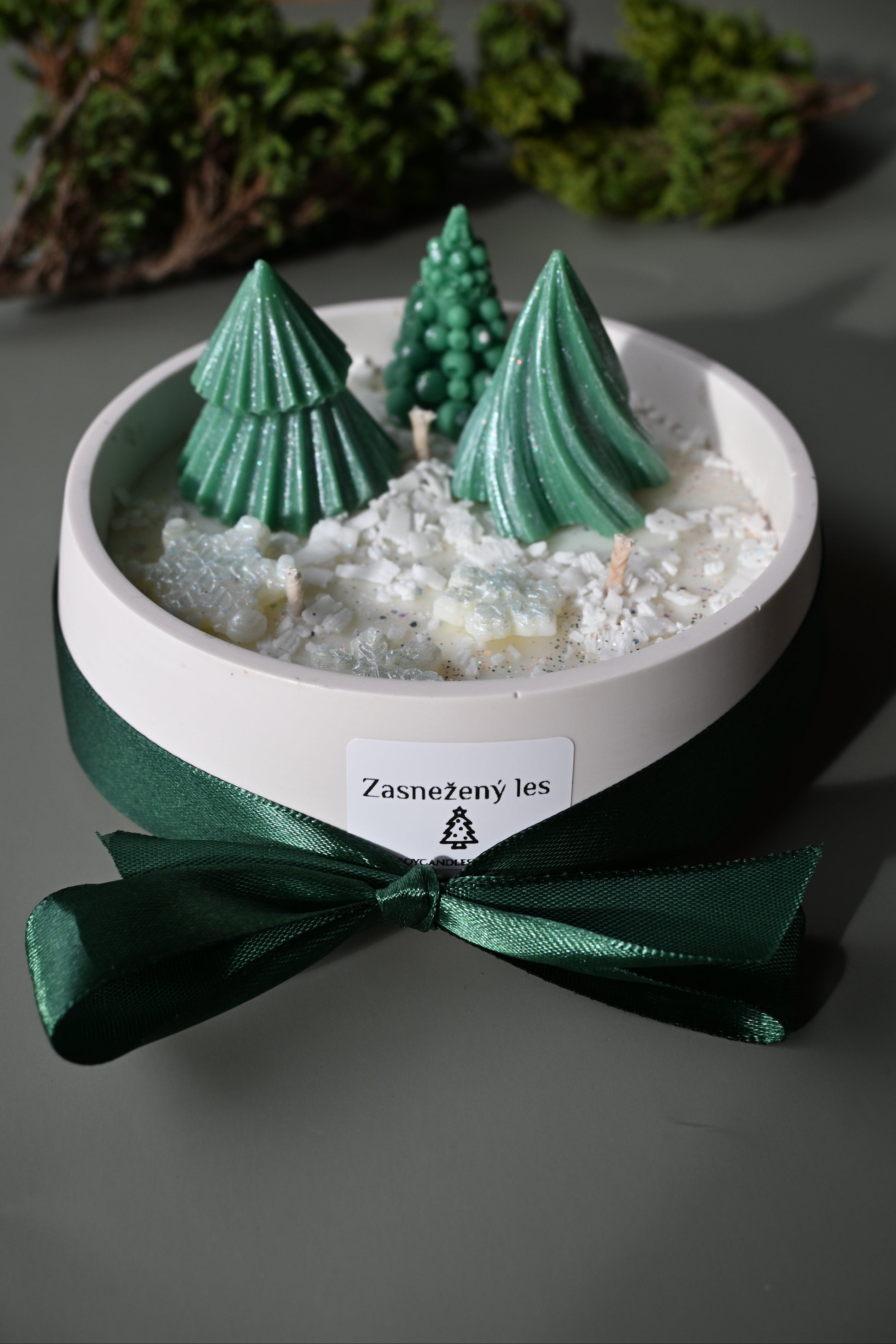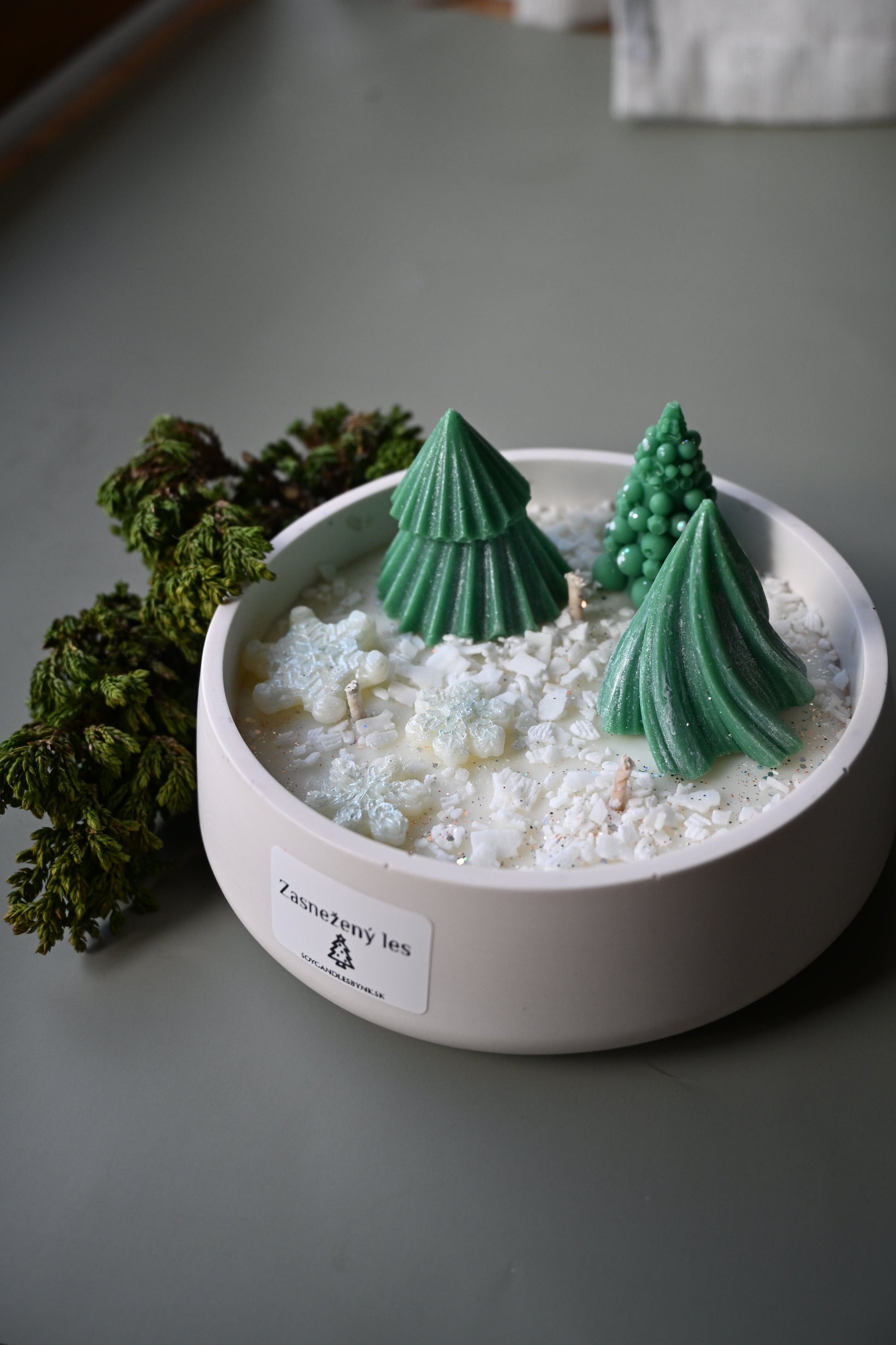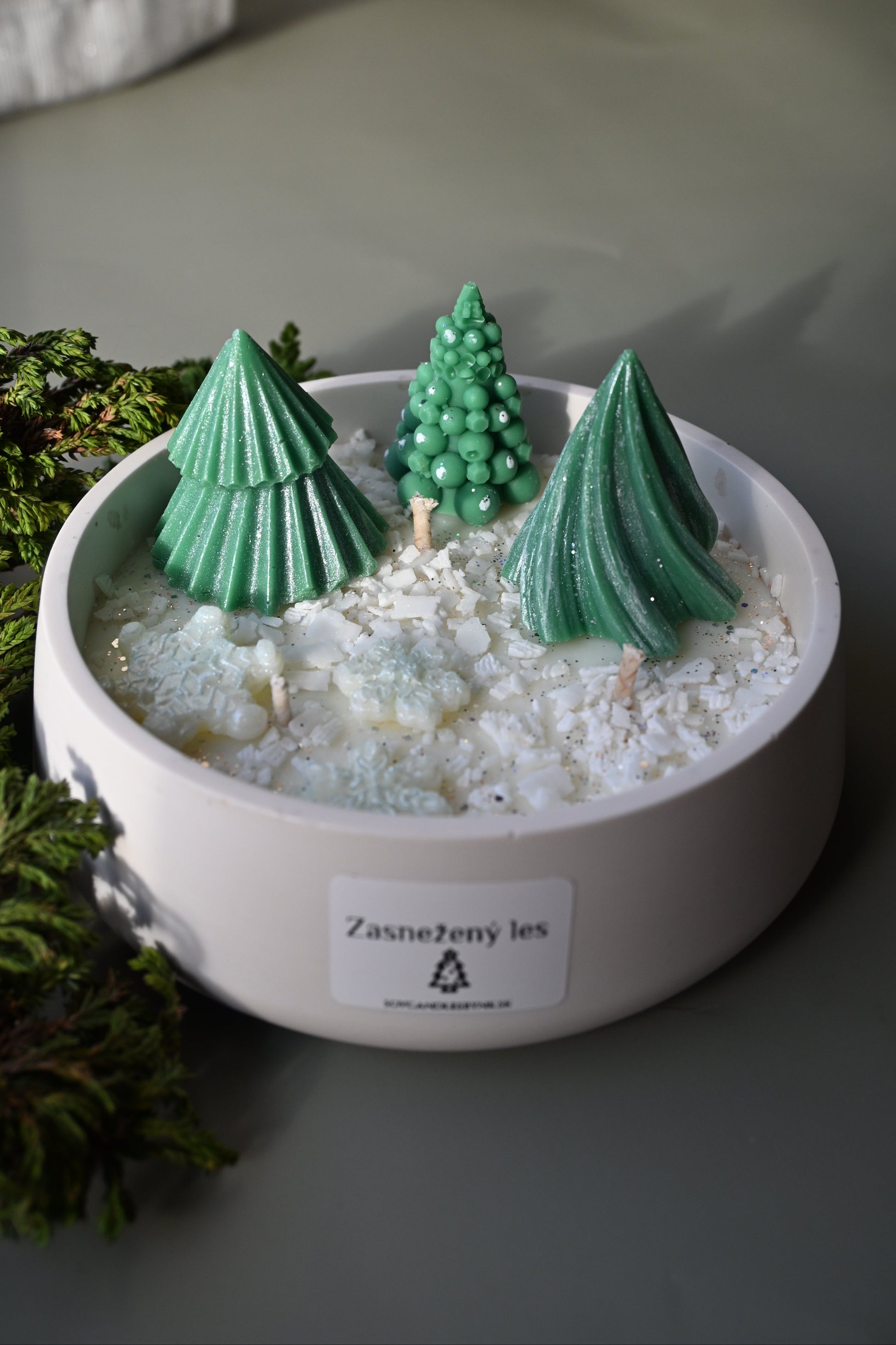 Zasnežený les je ručne vyrábaná sójová sviečka. Jej povrch zdobia malé voskové stromčeky posypané trblietavým snehom – ako malá zimná krajinka v miske.
