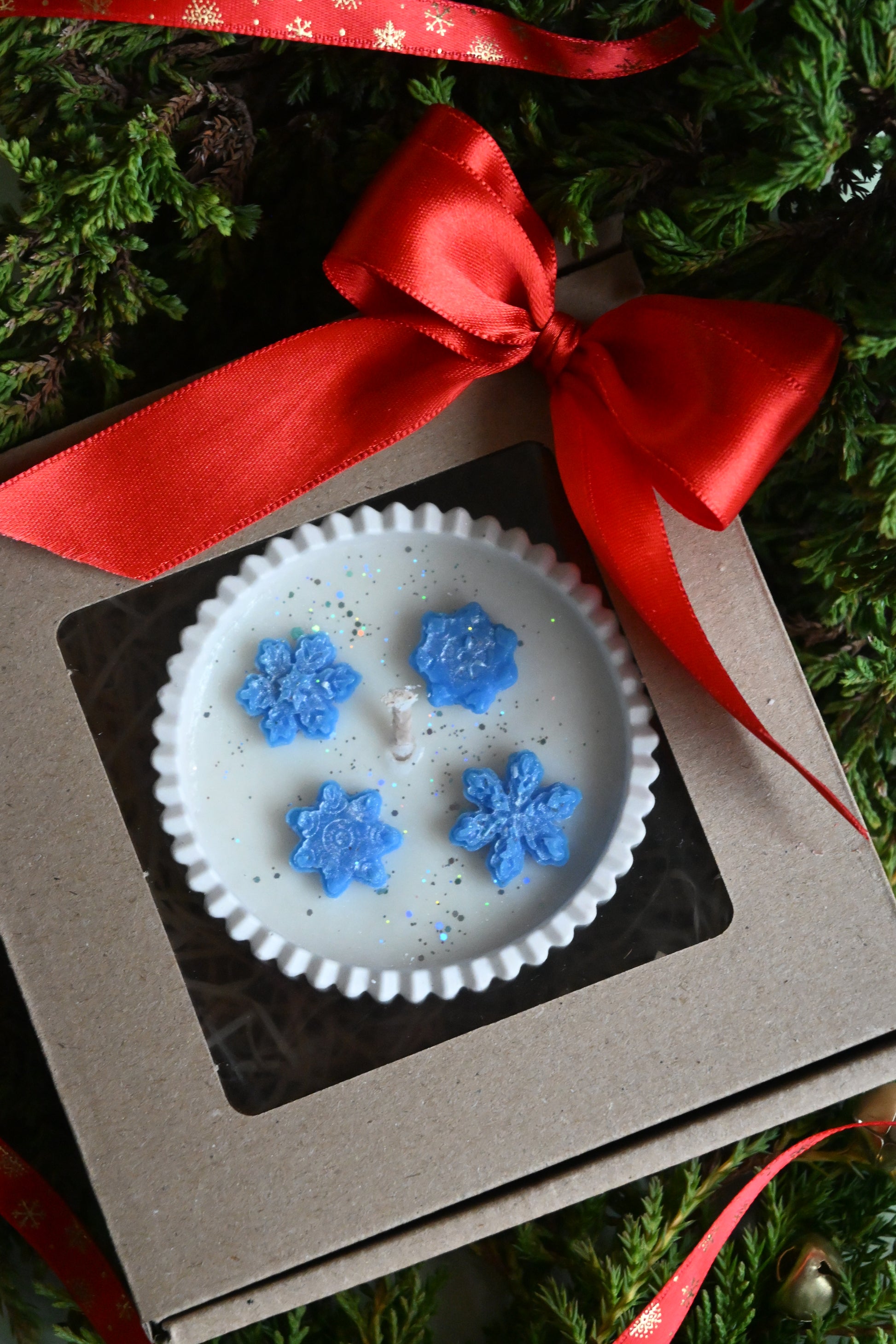 Ozdobená je jemnými modrými vločkami a trblietkami, ktoré jej dodávajú mrazivý, no hrejivý vianočný nádych.